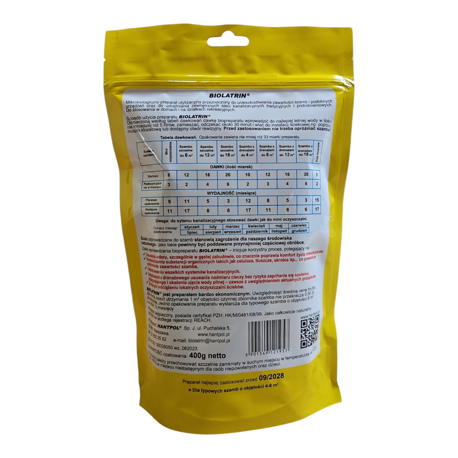 Odmierzoną według zamieszczonej „TABELI DAWKOWAŃ” ilość biopreparatu należy wprowadzić do letniej wody w ilości nie mniejszej niż 5 litrów, zamieszać, odczekać ok. 30 minut i wlać do instalacji ściekowej np. przez muszlę klozetową, lub bezpośrednio przez dostępny otwór rewizyjny.