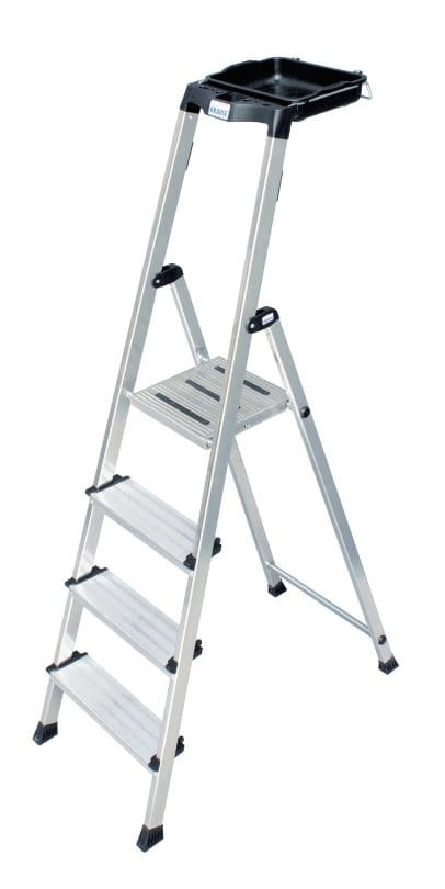 Aluminiowa drabina ze stopniami z wysoko umieszczonym pałąkiem, z możliwością wchodzenia z jednej strony. Duża ergonomiczna, specjalnie formowana półka na stałe zintegrowana z drabiną, specjalny uchwyt na wiadro i hak.
