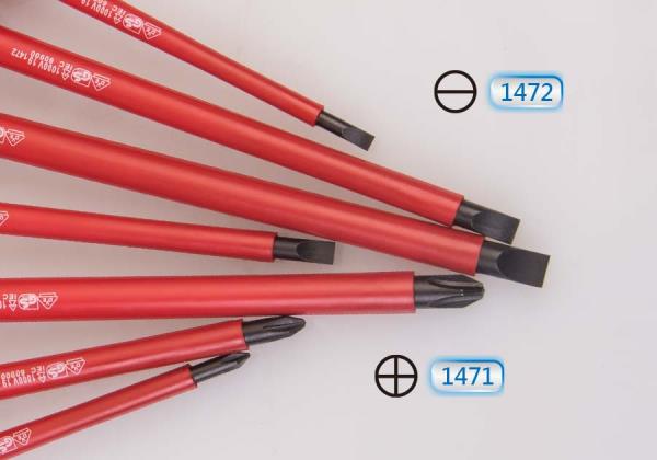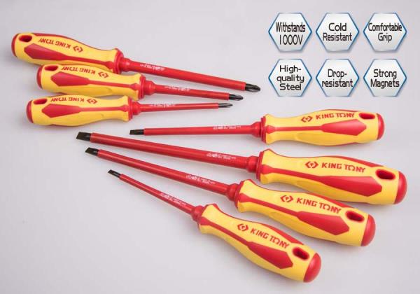 Zestaw wkrętaków izolowanych z końcówkami krzyżowymi oraz płaskimi. Wkrętaki izolowane do 1kV (1000V). W zestawie śrubokręty krzyżakowe No.1x100, No.2x100, No.3x150 oraz płaskie 4x100, 5.5x125, 6.5x150, 8.0x175.